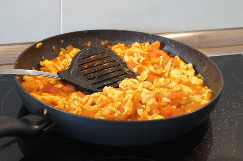 tomatoes and eggs in the pan